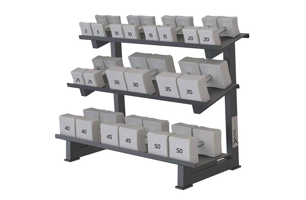 3-Tier Free-Weight RackThe FORMA Free-Weight Rack is a versatile weight storage system designed to hold a variety of combination sets for both dumbbells and kettlebells. The compact footprint enables the incremental addition of multiple racks to be placed side by side for a near seamless extension of storage.