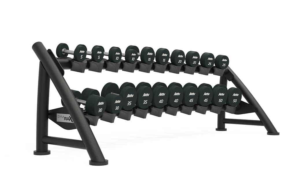 Two-Tier Saddle RackThe FORMA Two-Tier Dumbbell Saddle Rack holds up to 10-pairs of round dumbbells of any weight. The included dumbbell saddles help deaden the sound when re-racking while helping protect the finish and coating for extended life of your dumbbells.